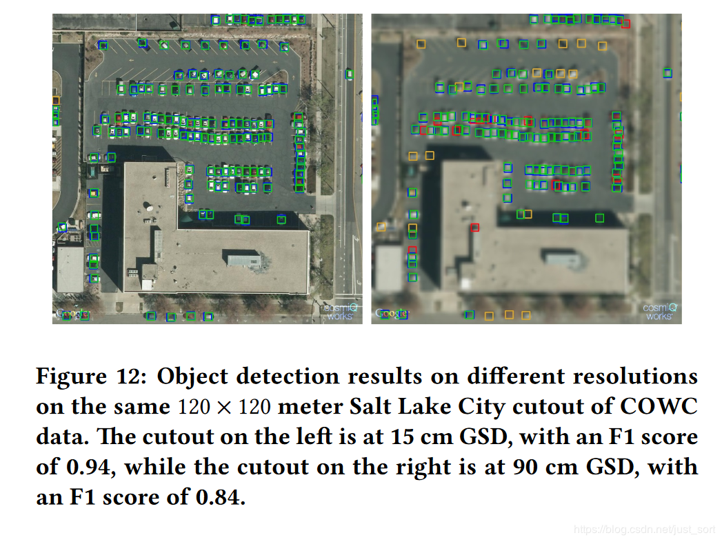 下面的Figure12则可视化了不同分辨率图像的检测效果,左边是15cm GSD的结果,右边则表示了90cm GSD的效果,直观来说,左边的效果是比右边好的。