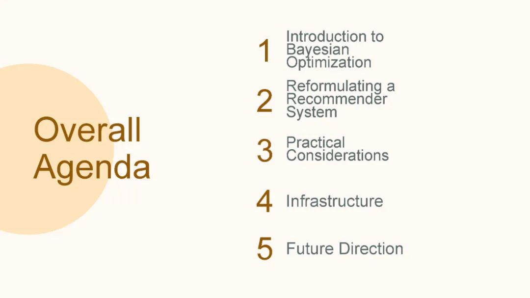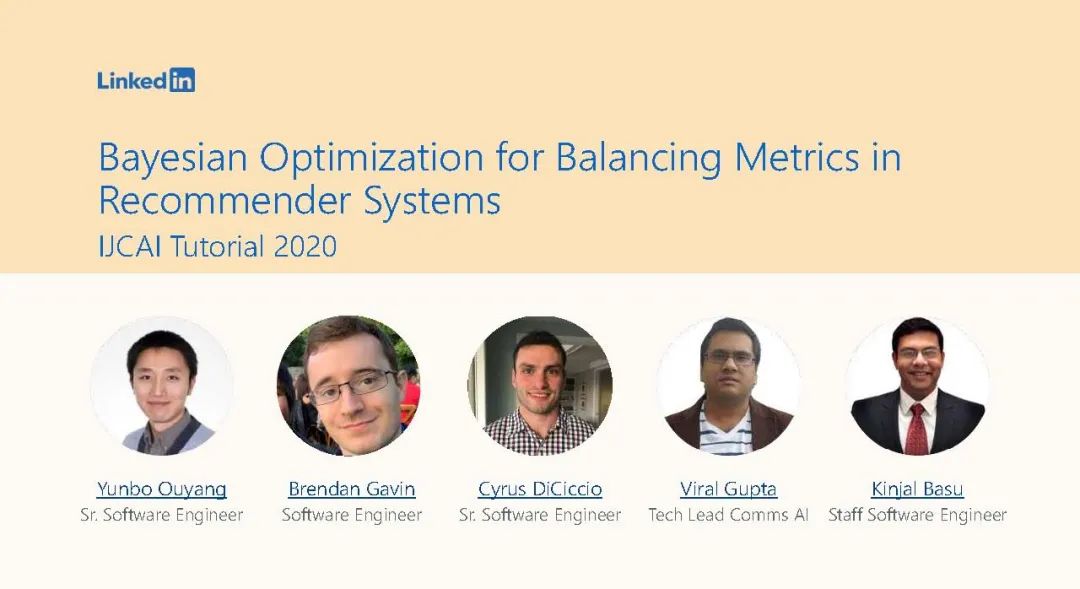 在本教程中,我们将讨论如何应用贝叶斯优化技术为这样复杂的在线系统获取参数,以平衡竞争性指标。首先,我们将深入介绍贝叶斯优化,包括一些基础知识以及该领域的最新进展。其次,我们将讨论如何将一个真实世界的推荐系统问题制定为一个可以通过贝叶斯优化解决的黑盒优化问题。我们将专注于一些关键问题,如新闻推送排名、人员推荐、工作推荐等。第三,我们将讨论解决方案的架构,以及我们如何能够为大规模系统部署它。最后,我们将讨论该领域的扩展和一些未来的发展方向。