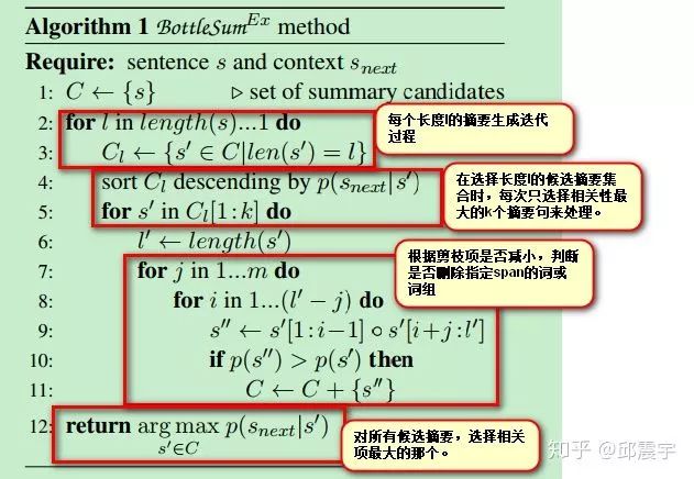 论文给出了优化算法的具体流程。因为没有训练集合验证集,因此无法直接去用训练的方式优化该函数。最直接的办法是,迭代生成摘要时时,保证剪枝项 减小,相关项