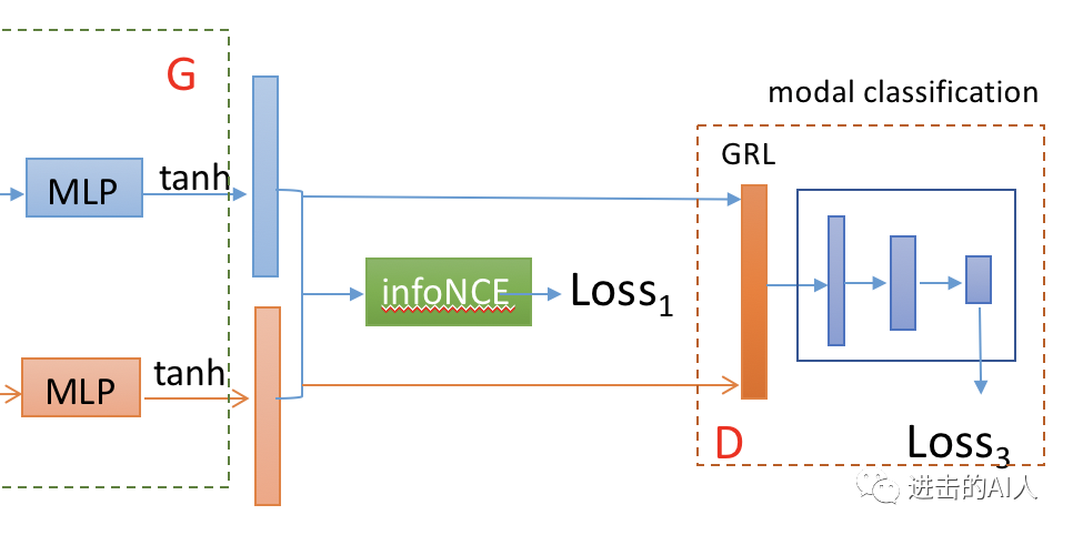 以图文跨模态检索为例,进一步思考以下几个问题:1)infoNCE Loss 是否可以对偶的用2次,即一图多文的图片视角 loss 和 一文多图的文本视角的 loss。2)如果GAN的目的是混淆图片和文本,那么上面说的图片和文本视角,还需要区分吗?3)如果 GAN 打破模态壁垒了,跨模态匹配是不是就等于同模态相似样本检索 instance discrimination,那么对应的 infoNCE 的负样本就可以同时包含2个模态样本了。比如图片,对应的负例可以是文本和图片。