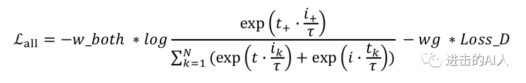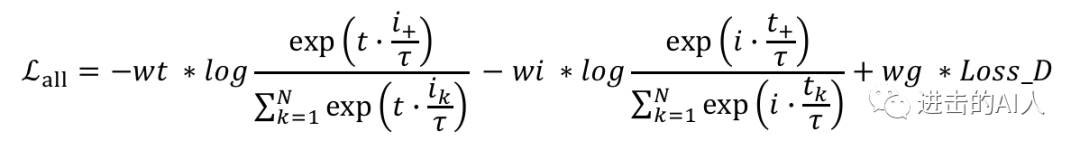 符号和字母都在前几篇介绍过,这里不多做解释了。这里2个模态的 loss 可以根据数据分布的差异以及业务目标的差异,设置不同的权重,以此来优化更好的结果。