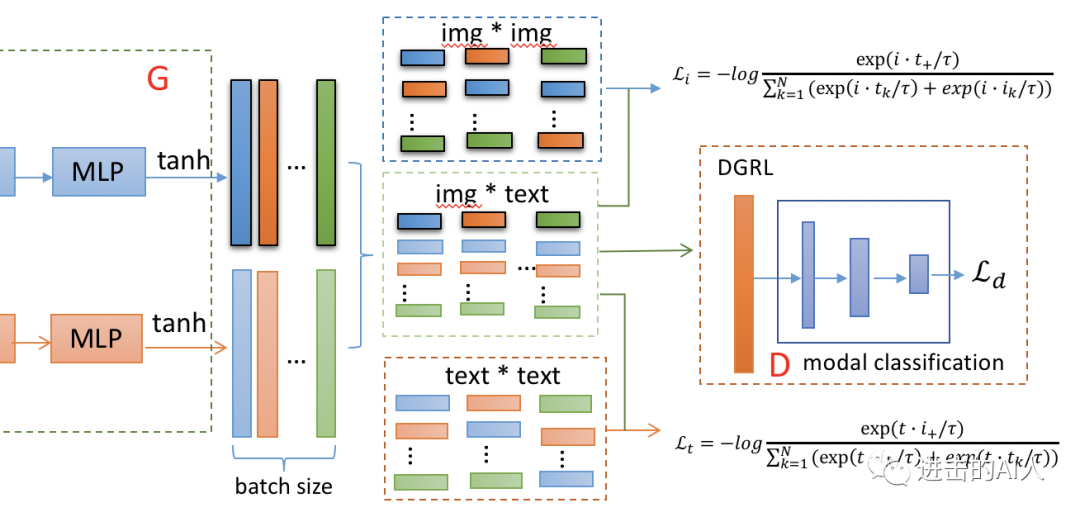 上图中,img 和 text 矩阵之间乘法是向量内积。结合 DGRL 层共同训练GAN,可以很好的融合2个模态信号。和之前提到的 dual-mode 改 both-mode 类似,也可以进一步将上面的 mix-dual 改成 mix-both,这里不再重复。