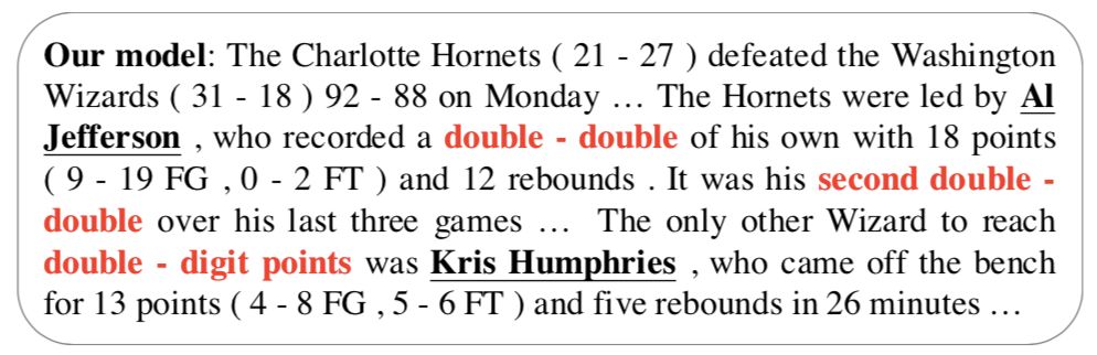 图1 ROTOWIRE数据集中的一个例子。左侧为输入的球队/球员的统计数据,右上为基线模型生成的结果,右下为参考文本。