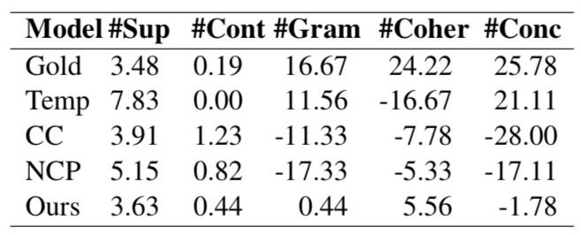 我们对比了我们的模型和基线模型(CC)、SOTA NCP+CC模型、基于模版生成的结果和参考文本生成的结果,发现: