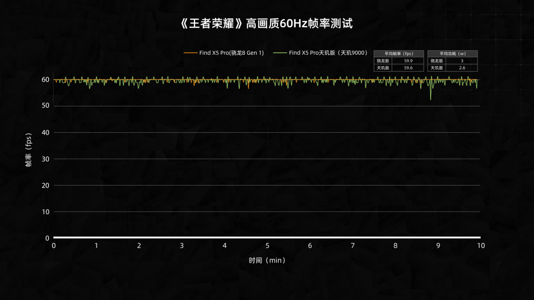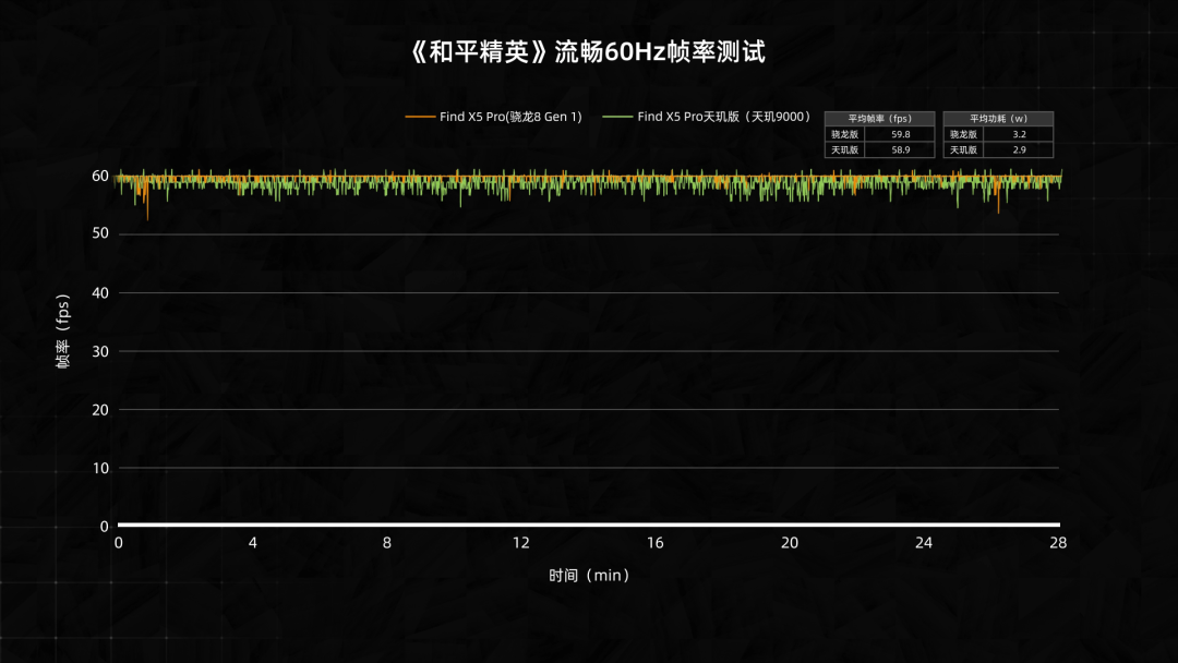 接下来是《和平精英》流畅 60 帧,选这个设置的原因是 Find X5 Pro 天玑版目前还没有适配 90Hz 模式,而且极限帧率只能是在流畅画质下运行。这一环天玑版的帧率表现并不占优,平均 58.9 帧,骁龙版 59.8 帧几乎跑满,不过同样的天玑版的功耗要略低于骁龙版。