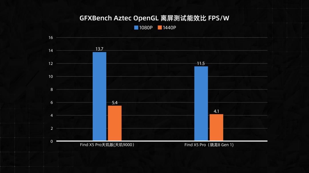 再来看功耗,天玑版 1080P 和 1440P 功耗分别为 7W 和 7.4W,骁龙版则飙到了 10W 和 10.6W,换算能效比之后,天玑 9000 表现还是优于骁龙 8 Gen 1 的。