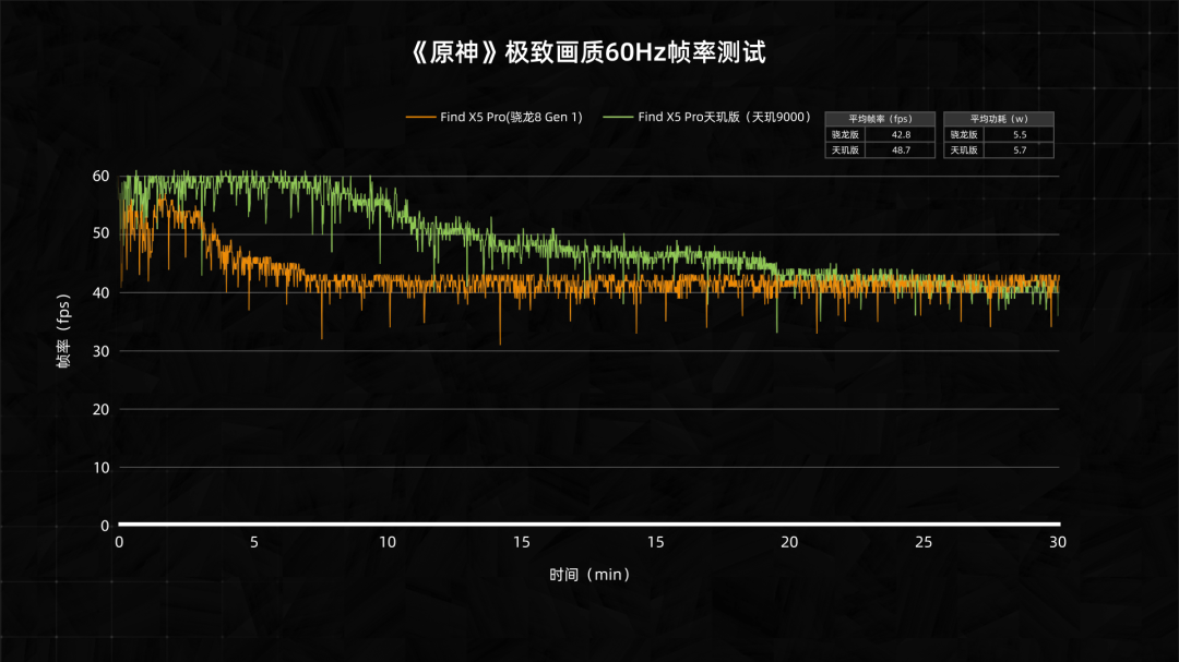 下面就是大家喜闻乐见的《原神》项目,我们直接用极致画质 60 帧来测。从帧率曲线上看的话,天玑是要比骁龙强不少,坚持了 7 分钟才开始降频,骁龙版是一开始就往下掉了,7 分钟之后开始锁帧。但是平均帧率一个 48.7 一个 42.8,这波天玑完全是靠同行衬托了,都没好到哪儿去,说明 OPPO 的调度策略还是太保守了。功耗上来看天玑版略高于骁龙版。