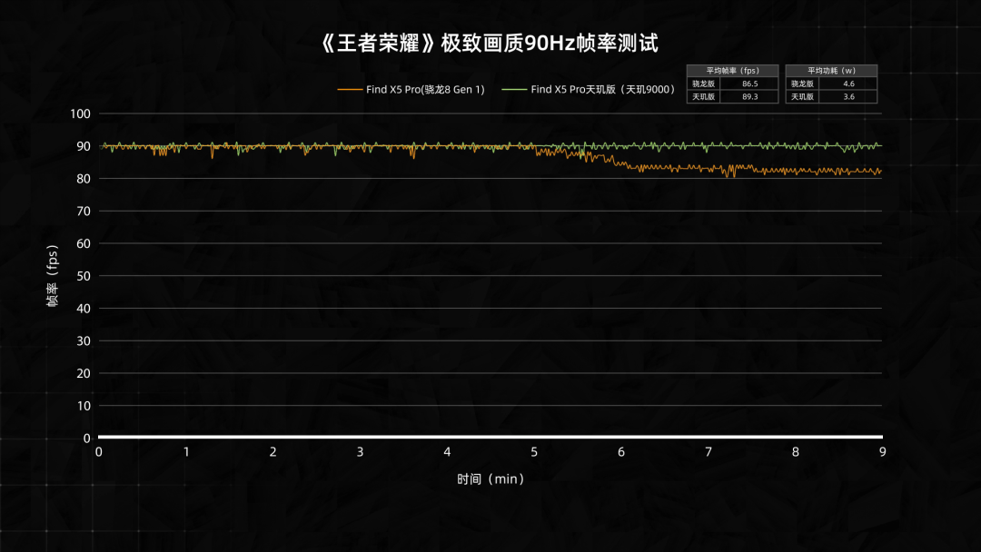 《王者荣耀》最高画质 90 帧,骁龙版平均帧率 86.5 帧,基本上 5 分钟之后就开始降频,而天玑版则基本全程稳定在 90 帧左右,功耗方面,天玑版 3.6W,骁龙版 4.6W。