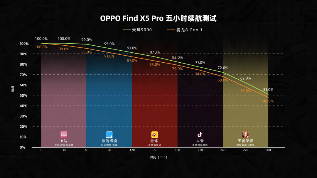 能够确定的是天玑版中低负载的性能和功耗表现要优于骁龙版,尤其是能效比大幅领先,但高负载表现不及预期。反映在整机续航上同样如此,五小时续航测试,天玑版比骁龙版多了 3% 的剩余电量,前期中低负载都能和骁龙版拉开差距,但到了重负载上优势慢慢减弱。
