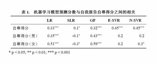 此次研究共招募182名研究生作为被试,包括100名男性和82名女性。要求被试在一块长方形地毯上来回走动两分钟, Kinect 摄像头置于地毯两端,收集被试步态数据, Kinect 以每秒20帧的速度捕获人体25个关节在 X, Y, Z 三个轴上的三维坐标。此外,被试需要完成罗森博格自尊量表(RSES)。研究人员对 Kinect 获取的原始数据进行降噪、坐标系转换和剪切后,使用快速傅里叶变换(Fast Fourier Transform, FFT)从每个关节点的每一轴(共三轴)抽取64个特征,计算每个特征与被试自尊得分的相关系数,并选取相关系数最大的5个特征来建立回归模型,共有360个特征进入模型训练(5×3×24)。研究分别使用线性回归(Linear Regression, LR)、简单线性回归(Simple Linear Regression, SLR)、高斯过程(Gaussian Processes, GP)、epsilon支持向量回归(epsilon-Support Vector Regression, E-SVR)、 nu 支持向量回归(nu-Support Vector Regression, N-SVR)方法建立回归模型并预测个体的自尊得分。预测结果与被试自我报告的自尊得分间的最高相关为0.45。鉴于男性和女性的步态存在一定差异,研究针对男性和女性的步态数据分别进行建模预测,对男性步态预测与自我报告得分之间的最高相关为0.43,女性为0.59。