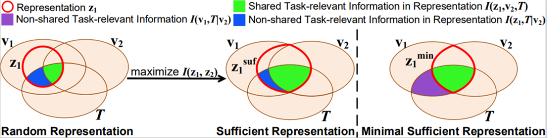 图6:对比学习中充分表示和最小充分表示的信息分布图