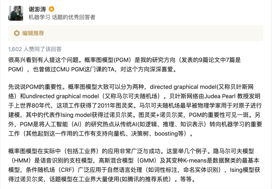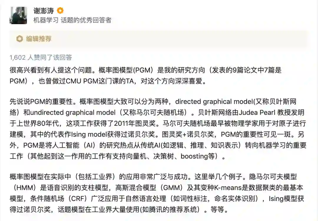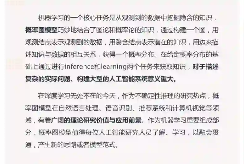 概率图模型(PGM)是用图来表示变量概率依赖关系的理论。自被图灵奖获得者Pearl提出以来,已成为不确定性推理近10年的研究热点,在统计机器学习、语音识别、计算机视觉和自然语言处理等领域有广阔的理论研究价格和应用前景,比如隐马尔可夫模型是语音识别的支柱模型,高斯混合模型及其变种K-means是数据聚类的最基本模型,条件随机场广泛应用于自然语言处理(如词性标注,命名实体识别)等。