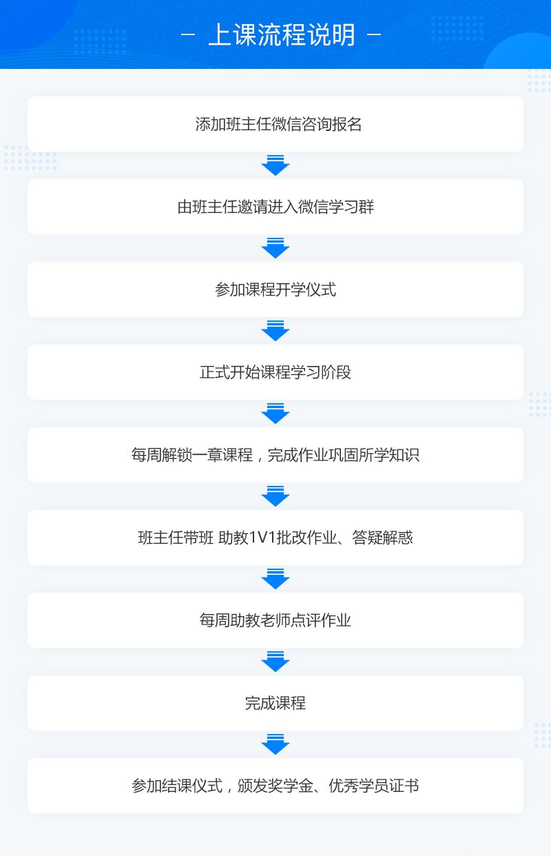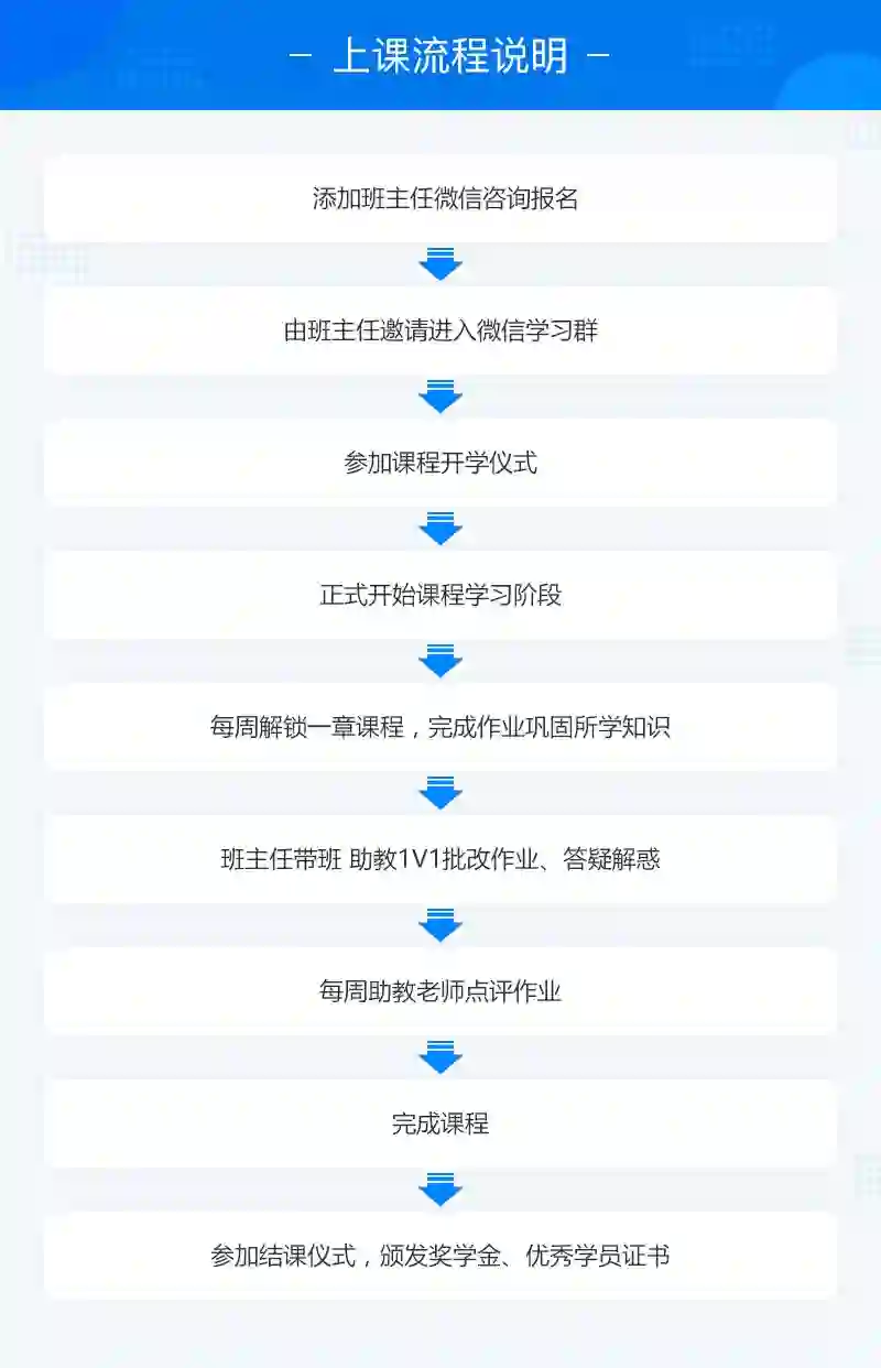 为了保证学习效果,本门课程采取录播的形式,每周解锁一章。建议同学们登陆深蓝学院PC端官网,体验更佳!在整个学习过程中,有班主任全程带班、监督学习及完成作业;助教老师每周1V1批改作业、及时反馈学习效果;课后微信群答疑解惑,同期学员相互交流学习。请大家每周留出至少4个小时的时间用来学习、做作业。