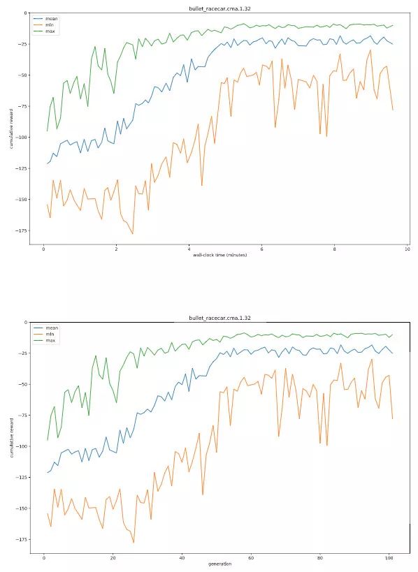 让我们首先尝试更简单的版本,赛车只需要学习一个跟踪巨型球移动的策略。在 RacecarBulletEnv-v0 环境中,智能代理获取球的相对坐标作为输入,并输出控制电机速度和转向方向的连续动作。该任务非常简单,在 2014 款 Macbook Pro(8 核 CPU)上只需要花费 5 分钟(50 次迭代)即可完成训练。使用 estool,下面的命令将启动一个含有 8 进程的训练程序,每个进程负责 4 项作业,这样总共就有 32 个工作器,然后使用 CMA-ES 来演进策略: