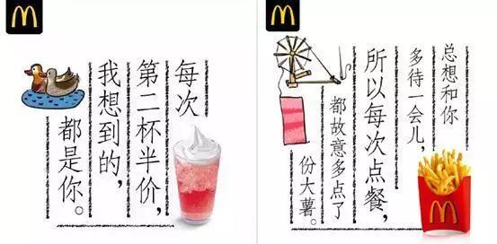 “每次第二杯半价,我想到的都是你”在人们购买麦当劳时经常遇到的场景中植入情感触发点,而“每次点餐,都故意多点了份大薯”,具象化的细节让人好像看到坐在餐厅里欲说还休的小情侣模样。