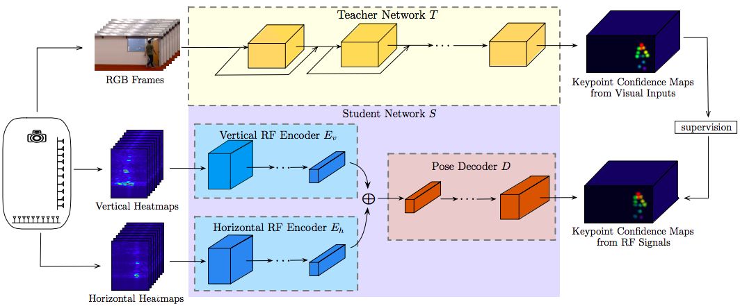 研究人员使用一个基于图片的神经网络来做“老师”,另一个基于无线信号的神经网络来当“学生”。老师看图片知道里面的人体姿态然后告诉学生,学生则需要学会从无线信号中也找到同样的结果。通过这样的方法训练出来的“学生”神经网络,就具备了利用无线信号识别人体姿态的能力。