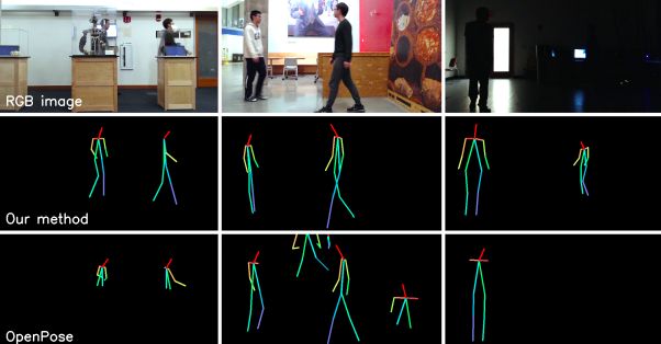 RF-Pose超越了当前最好的基于视觉的人体姿态估计系统:第一行是RGB图像;第二行是RF-Pose的结果,这是仅从无线信号中学习到的人体骨架;第三行是OpenPose的结果,这是当前性能最好的基于视觉的人体姿态估计系统。在有遮挡、光线昏暗等场景中,RF-Pose性能明显更优。来源:研究论文