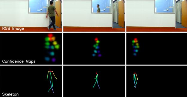 MIT的WiFi人体姿态估计系统,在人走到墙后时也能提取关键点,生成人体姿态关节点骨架。最上面一行是RGB图,中间是置信点图,最下面一行就是关节点骨架。来源:MIT CSAIL
