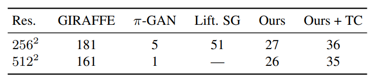 其中,3D GAN有使用和没使用三平面缓存(TC)方法的两种变体。实验在单个RTX 3090图形处理器上运行。