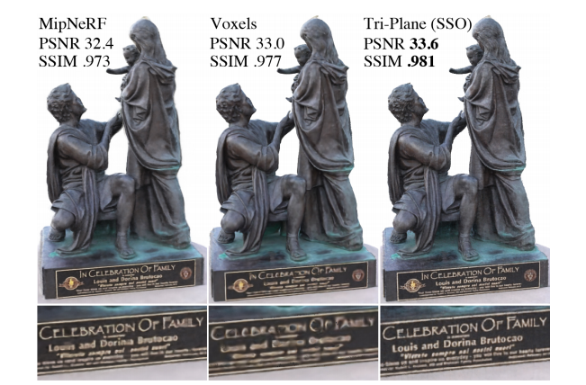 而该论文中提出的显式-隐式混合三平面表征方法不仅速度快,而且可以随着分辨率的增加而有效地扩展,在同等容量下可以获得更多细节。