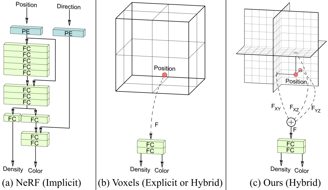 如上图a所示,神经隐性表征(NeRF)使用带有位置编码(PE)的全连接层(FC)来表示一个场景,但其查询速度很慢。