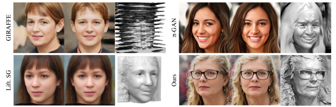 GIRAFFE,pi-GAN,Lifting StyleGAN和3D GAN产生的3D人脸效果
