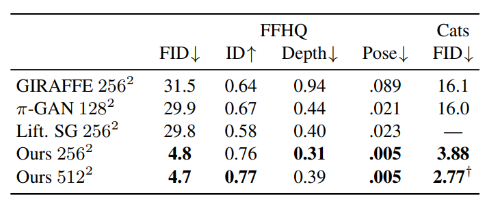 实验结果表明,论文提出的3D GAN在FFHQ和AFHQ Cats数据集上实现了SOTA的3D感知合成效果。