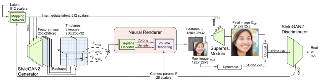 3D GAN框架包括几个部分:基于StyleGAN2的特征生成器和映射网络、具有轻量级特征解码器的三平面3D表示模块、神经体积渲染器、超分辨率模块和具有dual discrimination的StyleGAN2鉴别器。
