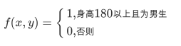 那么这个所谓的配对关系的正式名字叫什么呢?就叫特征函数。如前所述,它的粒度更小,直接将某个特征下的某个取值(当然这里是机器学习意义上的取值,因此值当然也可以代表180以下这种区间的形式)与某个类别封装成一个特征函数,基于一系列的特征函数去做进一步的分类等工作。所以可以形式化的将特征函数表示为: