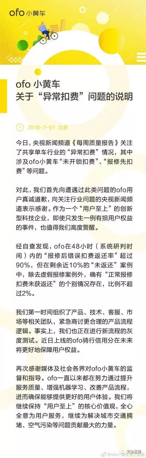 7月1日下午,ofo就近日ofo小黄车“为开锁扣费”、“报修先扣费”等异常扣费问题作出回应,称经自查发现,ofo在48小时(系统研判时间)内的“报修后错误扣费返还率”超过90%,但在剩余近10%的“未返还”案例中,除去虚假报修案例外,确有“正常报修扣费未获返还”的个别情况存在,比例不超过2%,同时也在进行新流程的灰度测试。