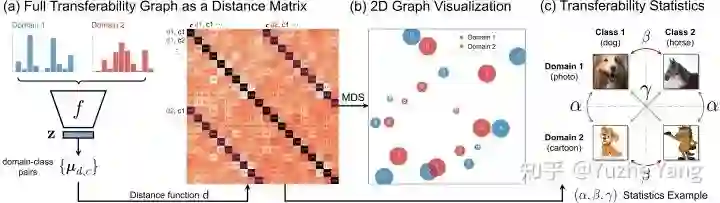 多维缩放(MDS)[2] 在2D平面上可视化这种相似性以及其可转移性图(图b)。