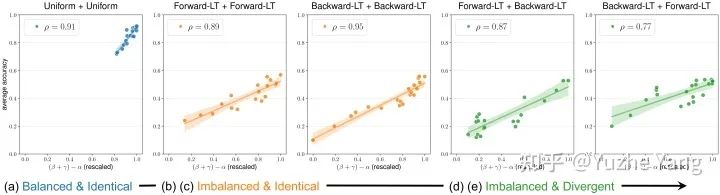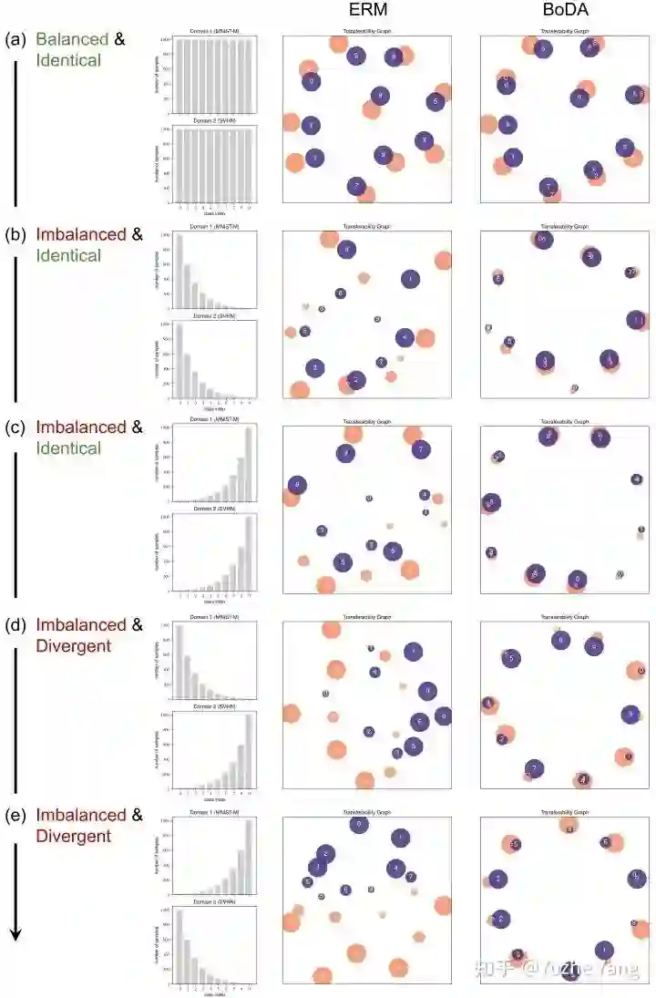 数据不平衡会增加学到不可迁移特征的风险。当跨域的标签分布一致且平衡时(图a),模型对变化的参数具有鲁棒性,在右上区域聚集。然而,随着标签变得不平衡(图b、c)和进一步发散(图d、e),模型学习不可迁移特征(即较低的