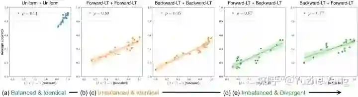 Motivating Example:同样,我们使用具有不同标签分布的 Digits-MLT。我们考虑三种不平衡类型来组成不同的标签配置:(1)统一(即平衡标签),(2)前向长尾,其中标签在类别ID上表现出长尾分布,以及(3)后向长尾,其中标签相对于类别ID 是反向长尾的。对于每种配置,我们训练了 20 个具有不同超参数的 ERM 模型。然后我们计算每个模型的 (