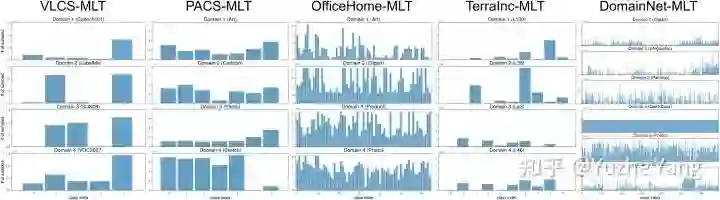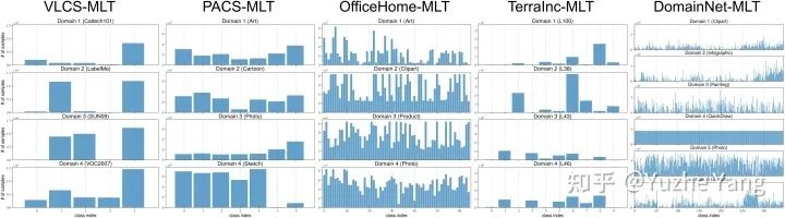 基准MDLT数据集:终于来到了激动人心的实验部分 ;) 为了方便对不平衡算法进行标准的测试,以及方便未来的research工作,我们在现有的multi-domain数据集基础上,建立了五个MDLT的基准数据集。具体来说,我们使用的是域泛化的基准数据集[5],并将它们用于 MDLT 评估。为此,我们为每个数据集创建两个平衡的数据集,一个用于验证,另一个用于测试,其余的用于训练。验证和测试数据集的大小分别约为原始数据的 5% 和 10%。这些数据集的训练数据分布如下图所示: