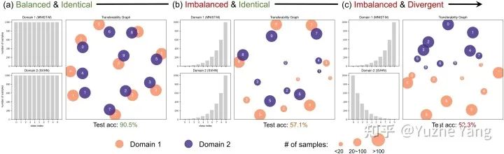 改变 Digits-MLT 的标签比例时可转移性图的演变模式。(a) 两个域的标签分布是平衡且相同的。(b) 两个域的标签分布不平衡但相同。(c) 两个域的标签分布不平衡且发散。