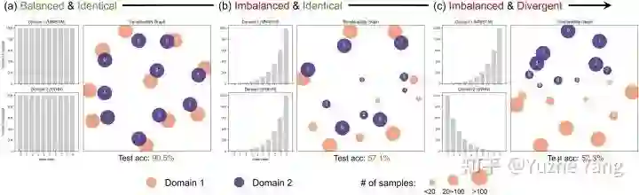 上图的结果揭示了有趣的观察结果。当每个域的标签分布平衡且跨域相同时,尽管存在域差距,但并不妨碍模型学习高精度(90.5%)的判别特征,如图a 所示。如果标签分布不平衡但保持相同(图b),ERM 仍然能够对齐两个域中的相似类,其中多数类(例如类9)在可转移性方面要好于少数类(例如类0)。相反,当标签在域之间既不平衡又不匹配时,如图c 所示,学习到的特征不再是可迁移的,这也导致了