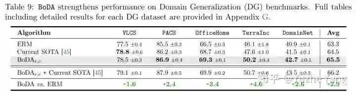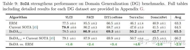 我们研究 BoDA 是否可以提高 DG 的性能。为了测试 BoDA,我们遵循标准的 DG 评估协议 [5]。通过上表,我们发现仅 BoDA 就可以在五个数据集中的四个上提升当前的结果,并实现显着的平均性能提升。