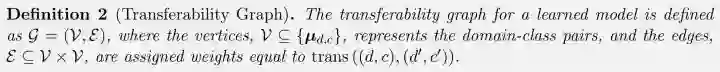 直观地说,两个域类对之间的可迁移性是它们特征之间的平均距离,表征它们在特征空间中的接近程度。距离函数 d 默认设置为 Euclidean distance(一阶统计量),但也可以选用其他距离来度量高阶统计量(例如用 Mahalanobis distance 也用到了 covariance)。那么自然而然地,基于 transferability 我们可以定义 transferability graph(可转移性图):