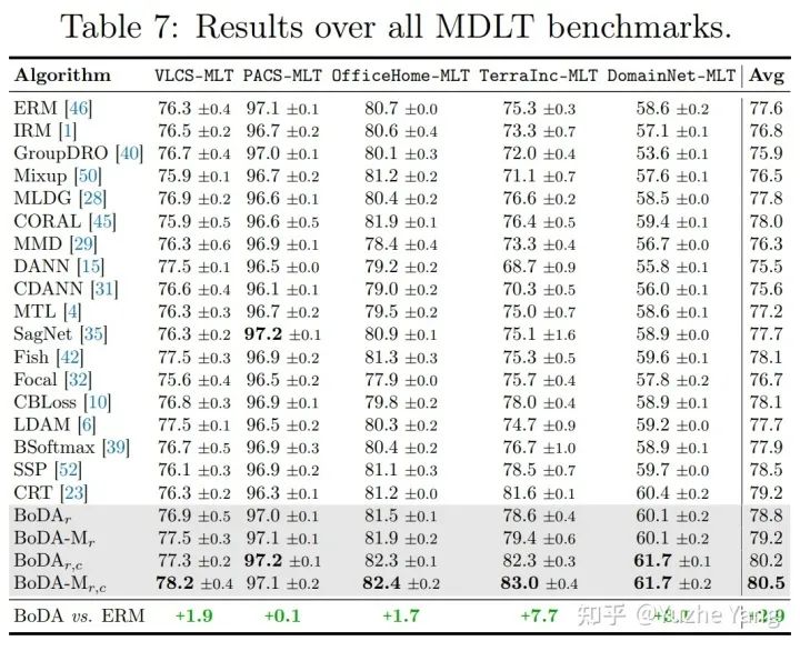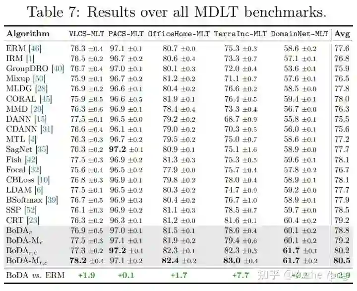 标签不平衡与现有的 DG 特定算法是正交的。最后,与 MDLT 类似,增益取决于数据集内不平衡的严重程度——例如,TerraInc 表现出跨域最严重的标签不平衡,而 BoDA 在其上获得最高增益。这些有趣的结果揭示了