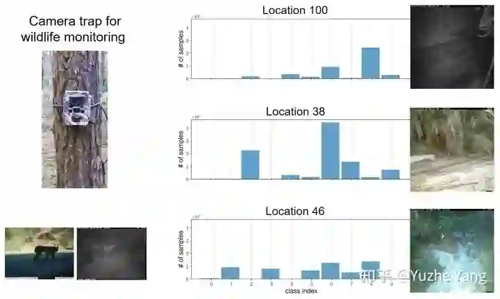 例如下图所示,Terra Incognita[1] 是一个实际采集的野生动物识别+分类的数据集。左边子图显示的是在不同位置建立的 camera trap,以及拍到的野生动物样例;而右图则是(一部分)不同 camera location 拿到的具体数据分布以及其拍摄效果。