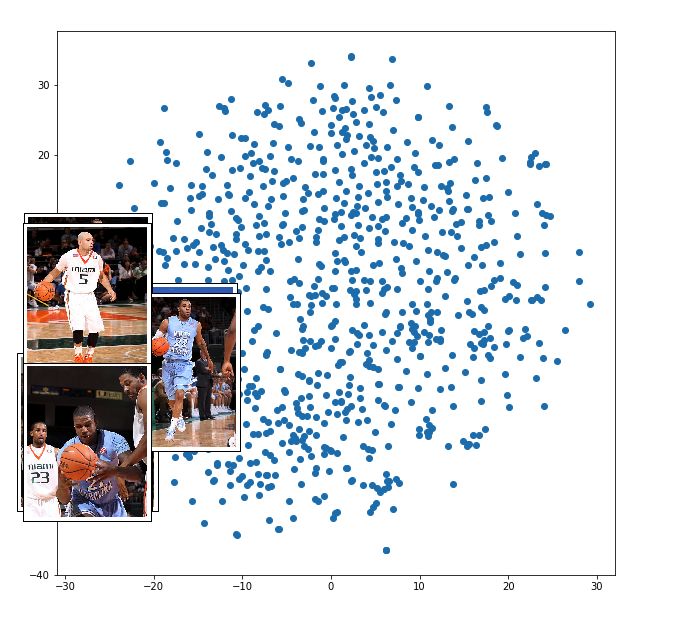 如果单词表示将类似的单词聚在一起,那么图像表示 (Inception 支持的图像编码器输出) 呢?我将相同的 t-SNE 技术应用于图像表示 (在 caption decoder 的第一步中作为输入的 300-dimensional tensor)。