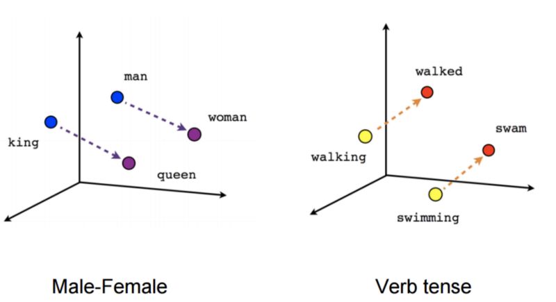关于词汇嵌入的一个令人兴奋的事实是,你可以对它们进行微积分。你可以用两个单词(如 “king” 和 “queen”) 并减去它们的表示来得到一个方向。当你把这个方向应用到另一个词的表示上 (如 “man”),你会得到一个与实际类似词 (比如 “woman”) 很接近的表示。这就是为什么 word2vec 一经推出就如此受欢迎的原因: