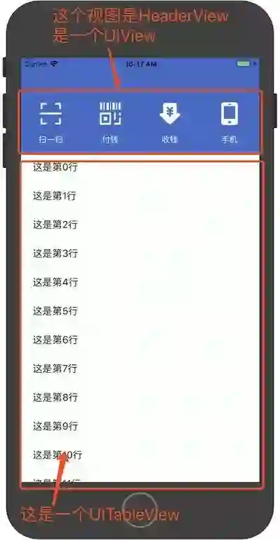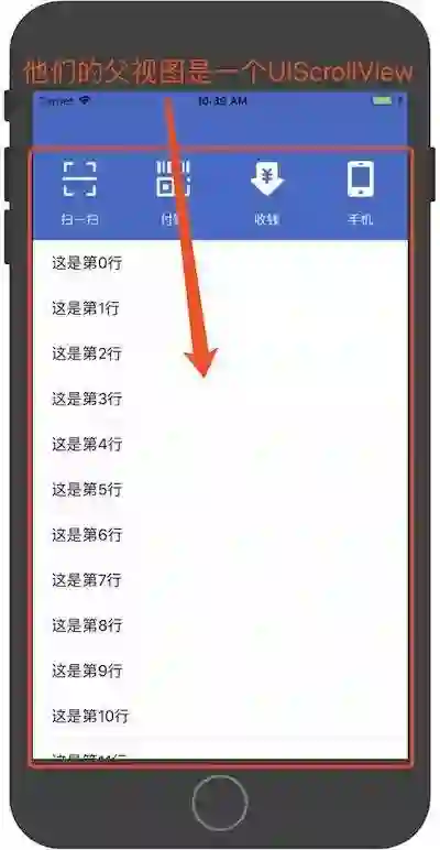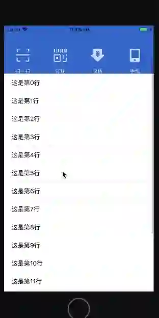 图片已经标明的很明白,我们在控制器先放上一个UIScrollView,在它的上面分别放上一个HeaderView(UIView)和一个UITableView。这时需要控制UITableView不能滑动,并且在设置高度时保持和行高*行数一致,也就是说这个方法适用于一些UITableView不必显示过多的页面,这里面不参与UITableView的复用,所有的Cell在一开始就显示出来了。ok,文字永远是枯燥的,上代码先: