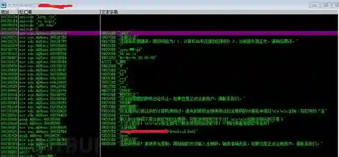 再回到我们的汇编窗口中,我们可以看到几个unicode的编码,疑似服务器的返回,记录下来。