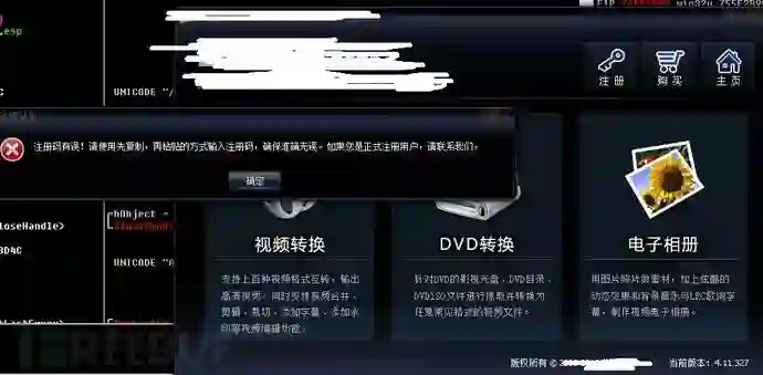 随便输入一个注册码然后确定,根据弹出的错误窗口来定位到客户端的注册检测验证的函数处。拖入OLLYdbg查找字串“注册码有误”,并跟踪到汇编窗口。