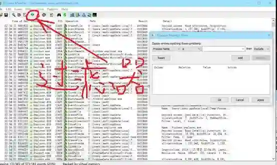 现在我们打开Process Monitor,使用过滤功能添加白名单使Pm仅显示该进程的相关信息。