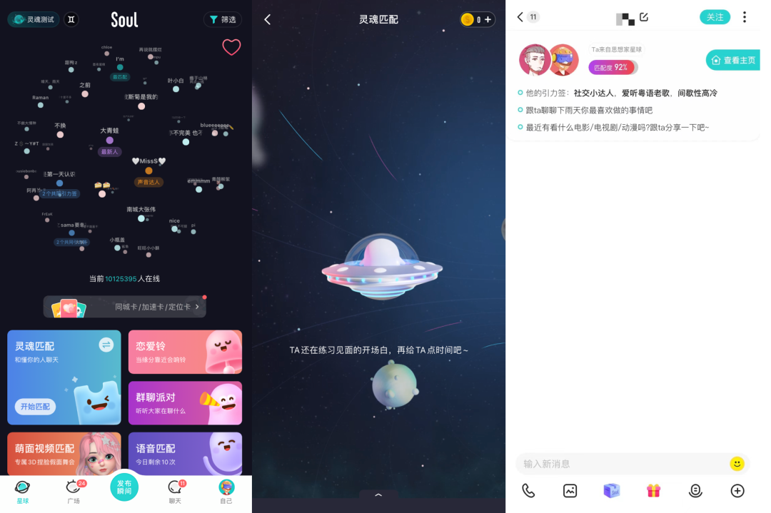 比如Soul,答完测试题就可以开始寻找灵魂好友,甚至都不需要设置真实头像。在探探、积目、她说等软件,还得用户双方看对眼才能成功聊天,Soul则是百分百“包匹配”。