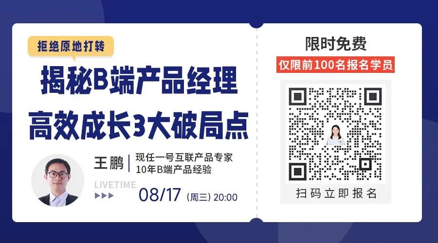 8月17日晚8点,10年B端老司机@王鹏老师在线分享,带你明晰B端产品经理发展路径,揭秘高效成长的三大破局点,告别野路子。