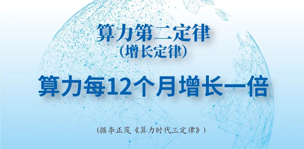 算力第二定律,即增长定律:算力每12个月增长一倍。受底层技术融合发展及加速成熟,尤其是5G以及物联网的大规模部署使得算力应用的范围大幅度增加,尤其是基于人工智能算法的智能业务正在从互联网行业开始向交通、工业、金融、政务等传统行业加速渗透,应用场景也从通用场景进一步拓展到行业场景,特别是在数字经济、数字社会和数字政府领域中得到了广泛的应用。在此过程中,算力资源增速显著,尤其是智能算力增速迅猛,已经打破“每隔18个月芯片性能可提升一倍”的摩尔定律,而由英伟达首席执行官黄仁勋提出的“黄氏定律”则预测 GPU 将推动 AI 性能实现逐年翻倍;赛迪研究院也预测2025年AI算力将成为绝对的主流。此外,随着元宇宙的技术成熟与应用场景拓展,算力资源的需求将进一步增大,将推动算力规模呈现出爆发式增长态势。因此综合当前发展态势与未来趋势分析,预计算力每12个月增长一倍成为新的规律。