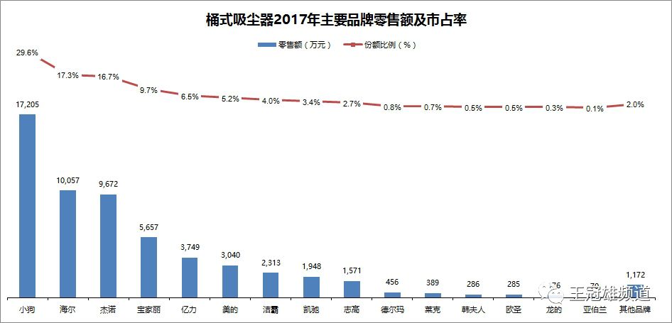 中怡康是专注中国消费品市场零售研究,也是国内最早做家电市场研究机构之一。根据中怡康发布的最新调查结果,2017年小狗电器吸尘器产品线上销售量位居第二,持续保持了品牌优势地位;同时,2017年小狗桶式吸尘器产品线上零售量、零售额均位居第一,并遥遥领先于其他品牌。在清洁家电领域,面对一线世界大厂,小狗电器的成绩再次诠释了专业和聚焦的重要性。